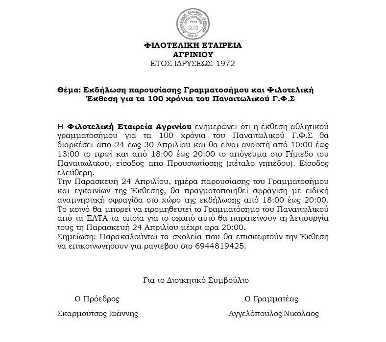 - Έκθεση Αθλητικού Γραμματοσήμου “100 Χρόνια Παναιτωλικός Γ.Φ.Σ.”