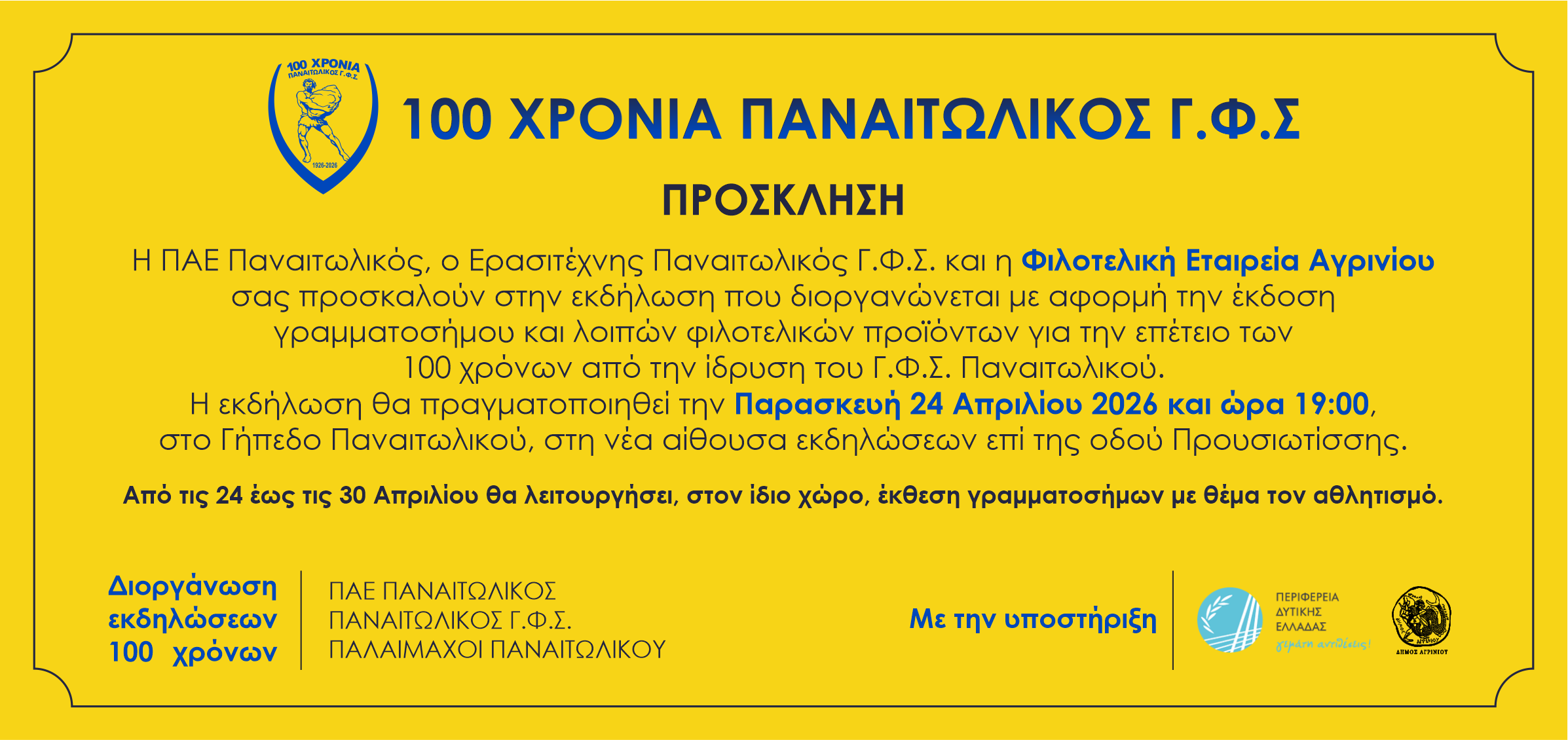 - ΠΡΟΣΚΛΗΣΗ – 100 ΧΡΟΝΙΑ ΠΑΝΑΙΤΩΛΙΚΟΣ Γ.Φ.Σ. – Έκδοση Γραμματοσήμου